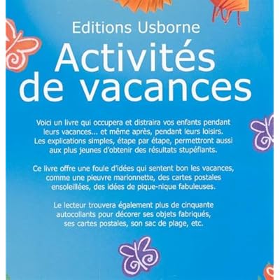 Voici un livre qui occupera et distraira vos enfants pendants leurs vacances...et même après, pendant leurs loisirs. Les explications simples, étape par étape, permettront aussi aux plus jeunes d'obtenir des résultats stupéfiants. Ce livre offre une foule d'idées qui sentent bon les vacances, comme une pieuvres marionnette, des cartes postales ensoleillées, des idées de pique-nique fabuleuses. Le lecteur trouvera également plus de cinquante autocollants pour décorer ses objets fabriqués, ses cartes postales, son sac de plage, etc.