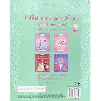 Eh oui, elles ont 30 ans et n’ont pas pris une ride (veinardes !). Et pour célébrer cet anniversaire, les éditions Usborne ont eu la TRES bonne idée de réunir dans un splendide coffret 4 des titres les plus célébres :◾Retrouve mes amies pour une séance photo, une audition, un essayage de vêtements, le tournage d’un drame historique et d’un film d’action, une cérémonie de récompenses, et bien d’autres aventures tout aussi excitantes.◾Il y a plus de 350 autocollants de costumes et accessoires fabuleux pour habiller les filles lorsqu’elles filment ou selon l’occasion.◾Les amies dansent à présent, et parfois avec un partenaire !◾Danses classique, indienne, disco, rétro, samba, claquettes, et bien d’autres encore… Il faut habiller les danseurs selon la danse.◾Avec plus de 300 autocollants de tenues et accessoires très colorés absolument fabuleux.◾Trois jolies fées se promènent dans les pages de ce livre, dans un jardin, à une fête ou en visite à la reine des fées… il y a treize scènes en tout.◾Plus de 400 autocollants d’adorables tenues et accessoires divers pour les habiller selon les différentes occasions.◾Trois princesses vivent leur vie de rêve au fil des pages de ce livre : elles font des achats, vont à une soirée ou font du patin à glace… Il y a treize scènes en tout.◾Plus de 400 autocollants d’adorables tenues et accessoires divers pour les habiller selon les différentes occasions. N.B : un magnifique poster complète l’ensemble et trouve vite sa place dans la chambre ! Youpiiiiii ! :) Les enfants adorent cette collection où ils choisissent d’habiller les personnages et de décorer les multiples scènes selon leur goût et leur inspiration du moment, à l’aide des nombreux autocollants de tenues et d’accessoires. Les plus grands apprécieront aussi ces moments d’échange et d’amusement. De très jolis albums – comme d’habitude – qui ne manqueront pas de ravir les petites mains. De jolis cadeaux, à garder de nombreuses années.
