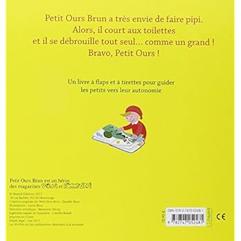 Petit Ours Brun est un grand, il sait aller faire pipi tout seul !Relever la cuvette, baisser son pantalon, dérouler le papier ou encore tirer la chasse d'eau, c'est facile, et c'est amusant !Un album ludique, à flaps et à tirettes, pour accompagner les petits dans l'une des étapes les plus importantes de leur autonomie !
